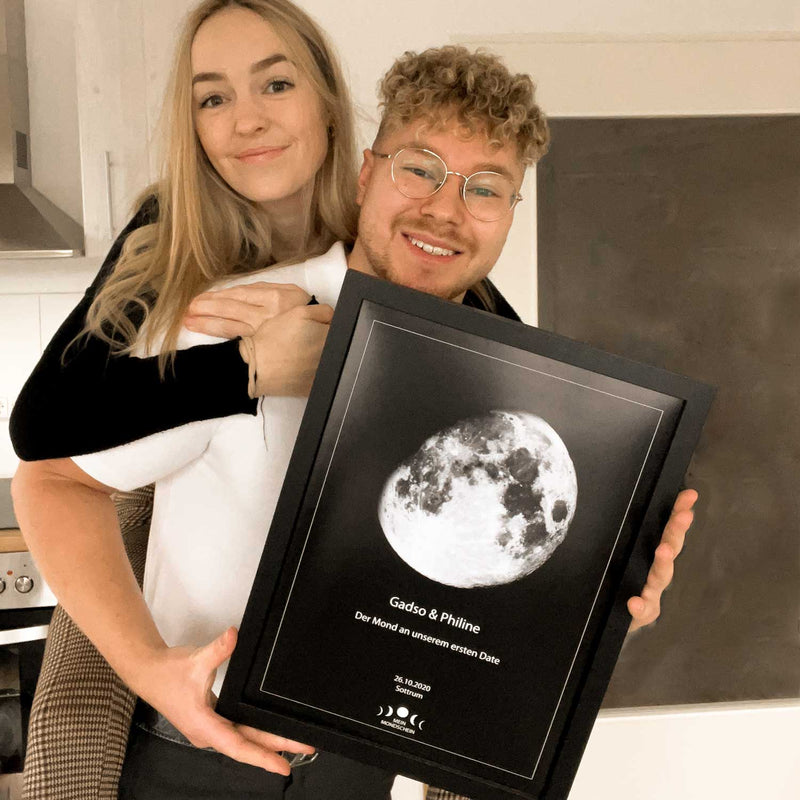 Mit unseren individuellen Mondpostern kannst du einen besonderen Moment für immer festhalten. Wir zeigen genau die Mondphase, wie sie am Himmel zu einem für dich bedeutungsvollen Datum zu sehen war. Durch die Möglichkeit, eine persönliche Widmung hinzuzufügen, wird jedes Poster zu einem unverwechselbaren und persönlichen Kunstwerk. Dies macht sie zu einem perfekten Geschenk, das Herzen berührt.